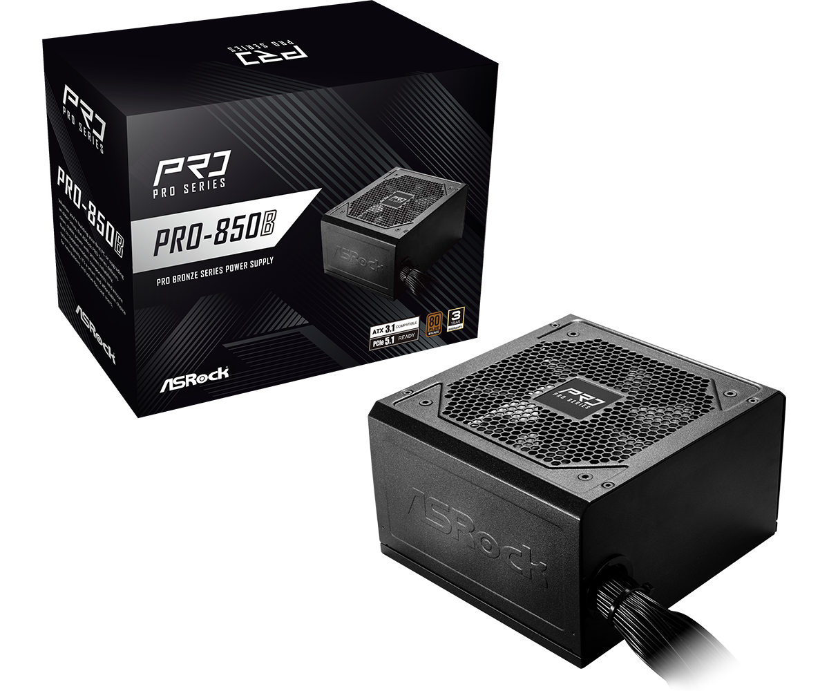 ASRock Pro Series PRO-850B 850W Power Supply - 80 PLUS BRONZE Certified - ATX 3.1 - PCIe 5.1 Ready - Native 12V-2x6 Connector (450W) - Low noise 120mm FAN - 2x PCIe 6+2pin Connector (PRO-850B)