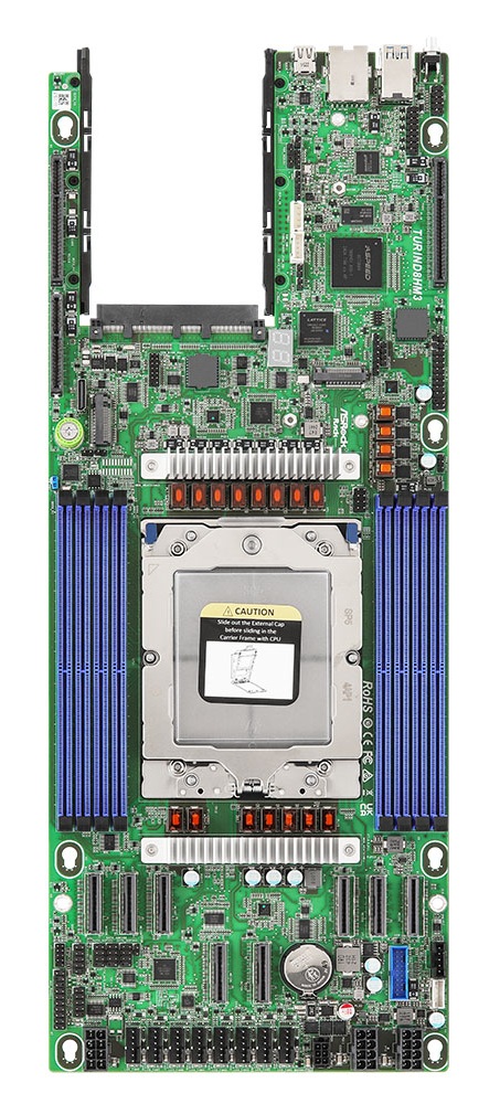 ASRock Rack TURIND8HM3 Half-Width Server Motherboard - Single Socket SP5 - 8x DIMM slots (Supports DDR5 RDIMM, RDIMM-3DS) - 2x PCIe5.0 x16 - 1x PCIe5.0 x8 - 1x OCuLink (2 SATA 6G/b) by ASM1061R - Remote Management (IPMI) - 2x M.2 Ports (TURIND8HM3)