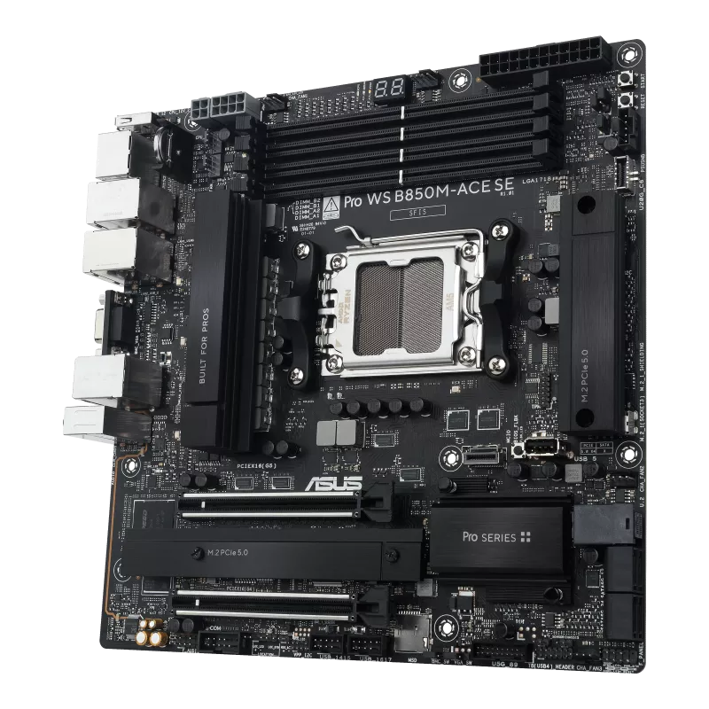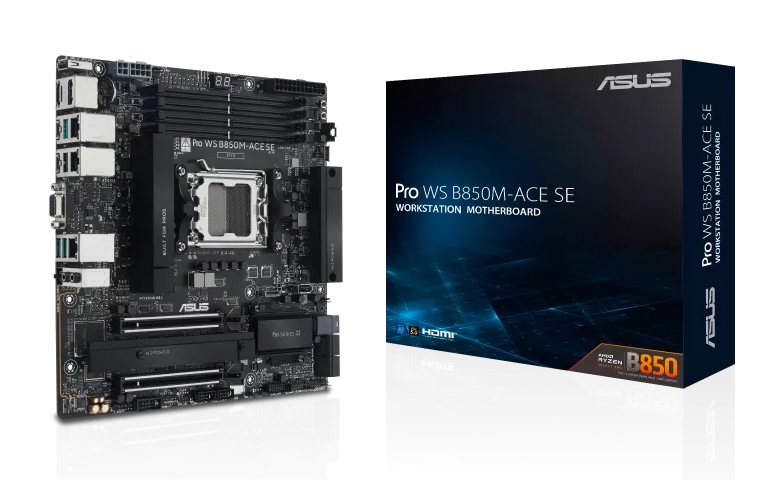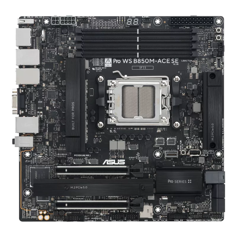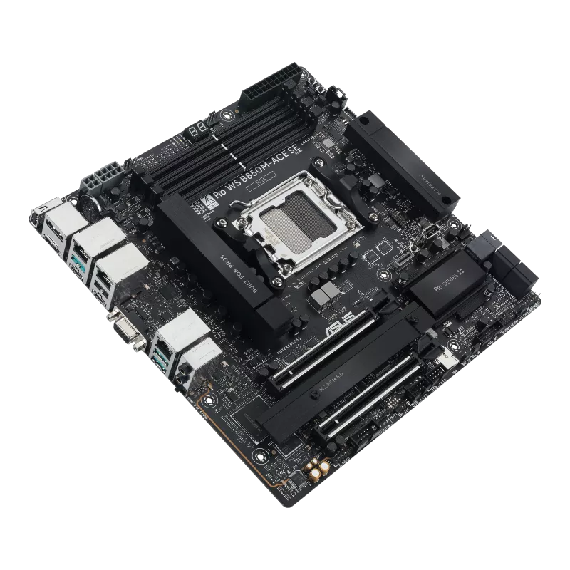 ASUS PRO WS B850M-ACE SE Micro-ATX Workstation Motherboard - Socket AM5 - 1x PCIe 5.0 x16 - 1x PCIe 4.0 x4 - Support DDR5-8000+(OC) - 2x M.2 Slots - U.2 Connector - USB 10Gbps Type-C with DP Alt - VGA - HDMI 2.1 - DisplayPort 1.4 - 2.5Gb LAN - 10Gb LAN