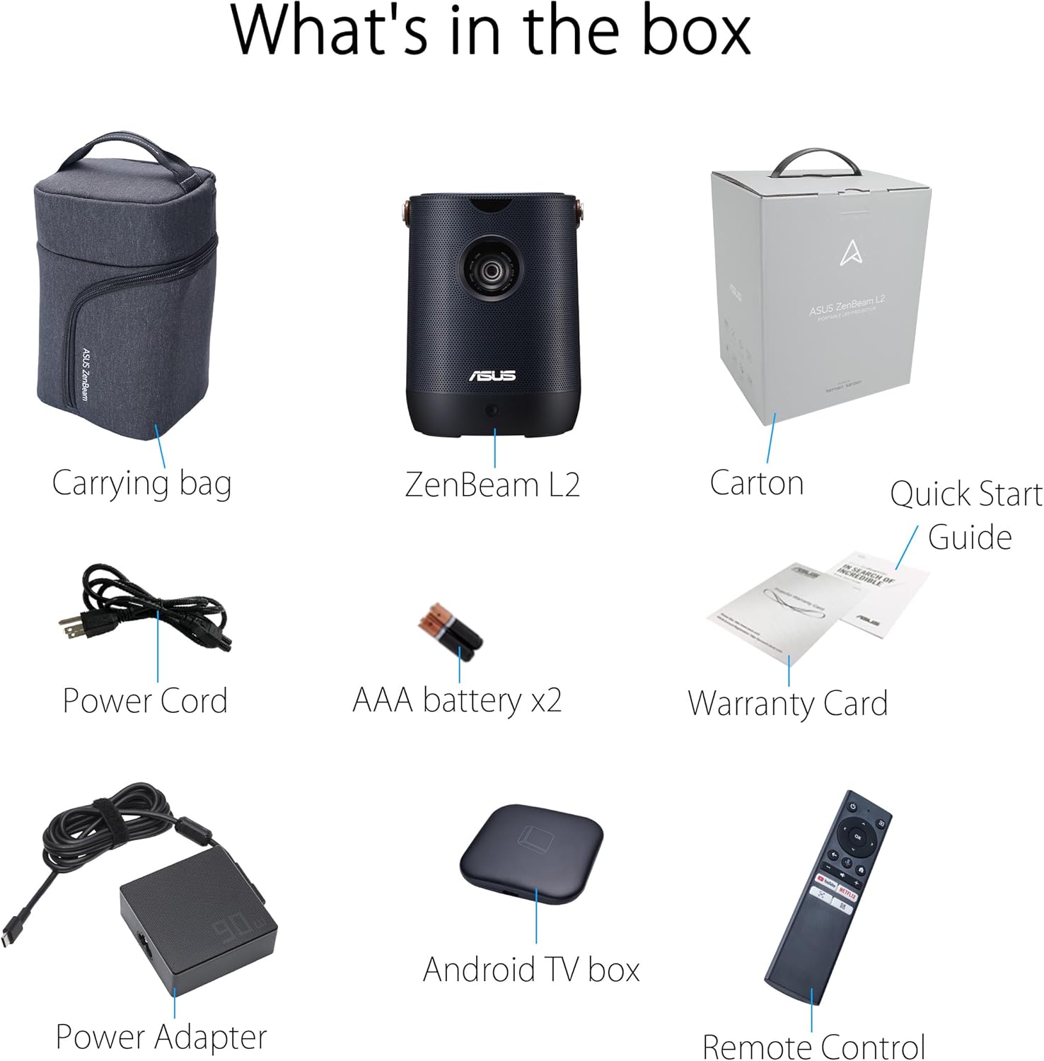 ASUS ZenBeam L2 Smart Portable LED Projector - 1920x1080 - 960 LED Lumens - Google Certified Android 12 TV Box - 10W Speaker - Built-in Battery - Chromecast - HDMI - USB-C with DP Alt mode - USB-C (DC-IN) - USB-A (5V/1.5A) - Earphone Jack (ZENBEAM L2)