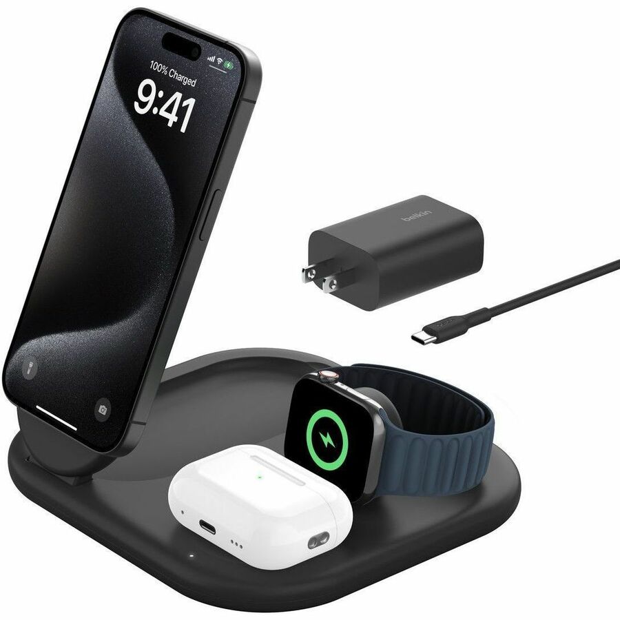 Belkin BoostCharge 3-in-1 Magnetic Foldable Wireless Charger with Qi2 15W - Black - MagSafe Compatible - Compact Folding Stand Design (WIZ029ttBK)