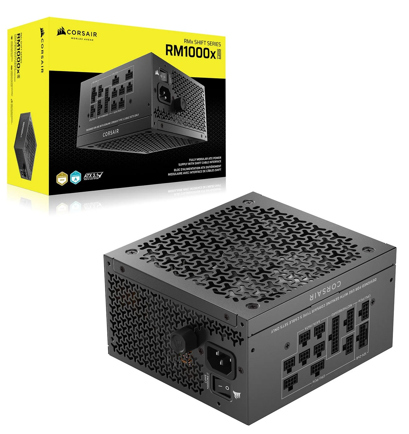 Corsair RMx SHIFT Series (2025) RM1000x SHIFT 1000W Fully Modular ATX Power Supply - Cybenetics Gold certified - ATX 3.1 - 600W Native 12V-2x6 GPU Cable - Fan Speed Control Knob - 140mm FDB Fan - 4x PCIe 6+2-pin Connectors (CP-9020300-NA)