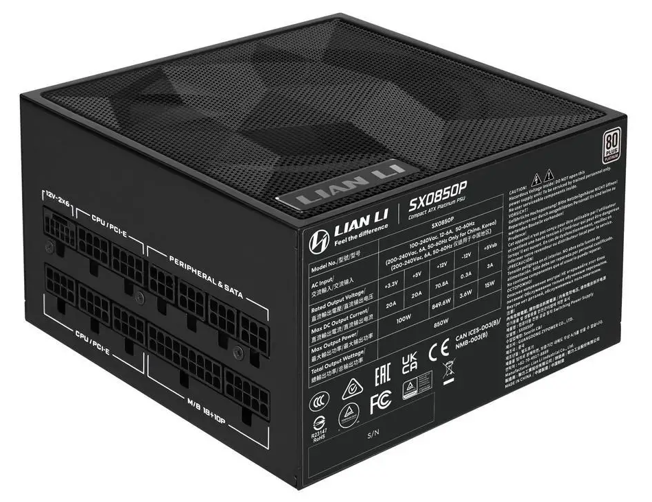 Lian Li SX Platinum SX850P 850W Full Modular ATX Power Supply - Black - 80 PLUS Platinum Certified - ATX 3.1 & PCIE 5.1 Ready - 120mm FDB Fan - 12V-2×6 Cable - 4x PCIe 6+2-pin Connectors (SX0850P.B)