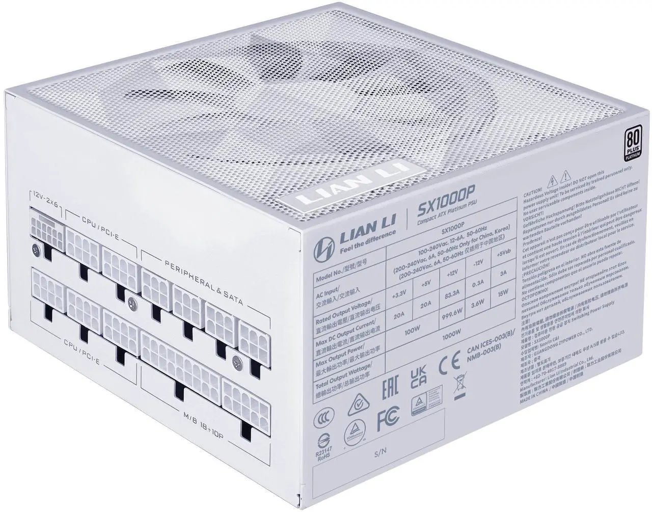 Lian Li SX Platinum SX1000P 1000W Full Modular ATX Power Supply - White - 80 PLUS Platinum Certified - ATX 3.1 & PCIE 5.1 Ready - 120mm FDB Fan - 12V-2×6 Cable - 5x PCIe 6+2-pin Connectors (SX1000P.W)