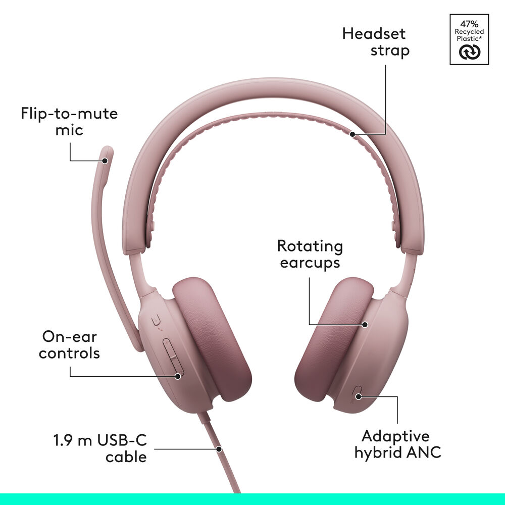Logitech Zone Wired 2 Noise-Cancelling Headset - Rose - Adaptive Hybrid Active Noise Cancellation - Intelligent Noise-Cancelling Microphones - Custom-tuned 40 mm Drivers (981-001613)