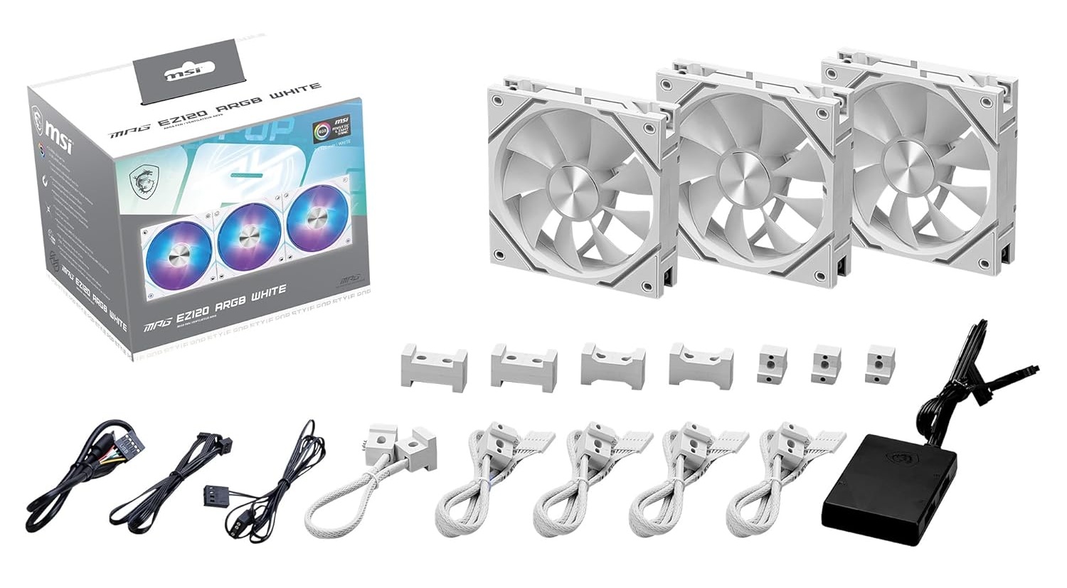 MSI MPG EZ120R ARGB 120mm Reverse Blade Case Fan - White - 3 Packs - Patented Magnetic Connector Blocks - FDB Bearing with Extra Nut Fixing - Fan Hub Included - Customizable ARGB Lighting (EZ120RARGB3W)