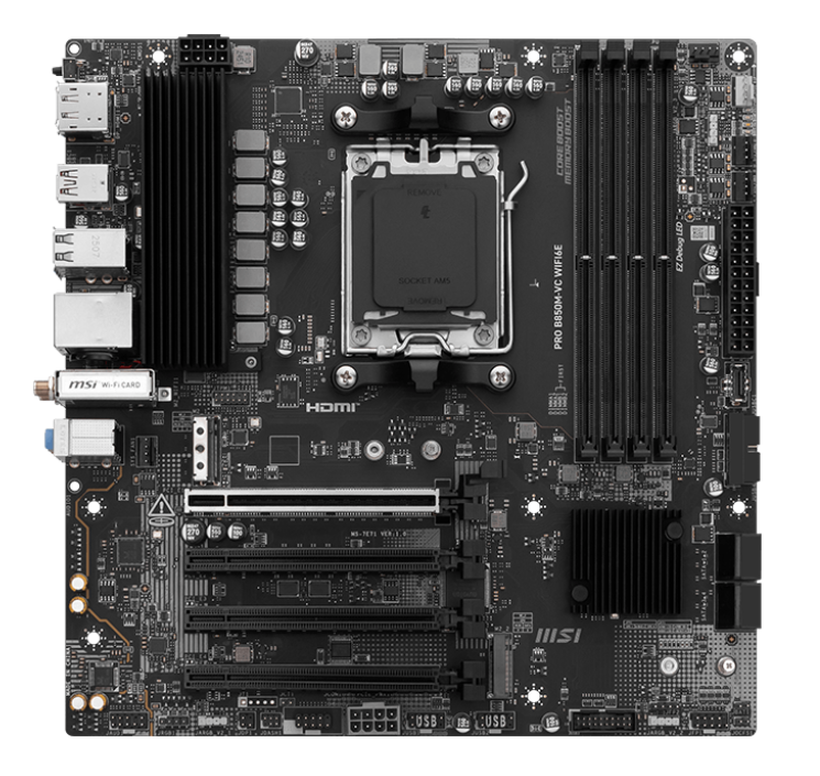 MSI PRO B850M-VC WIFI6E Micro-ATX Motherboard - Socket AM5 - 1x PCIe 5.0 x16 - 3x PCIe 3.0 x1 - Support DDR5-8200(OC) - 3x M.2 Slots - USB 10Gbps Type-C+A - HDMI 2.1 - DisplayPort 1.4 - Realtek 5Gb LAN - 802.11ax Wi-Fi 6E - BT 5.3 (PROB850MVCWIFI6E)