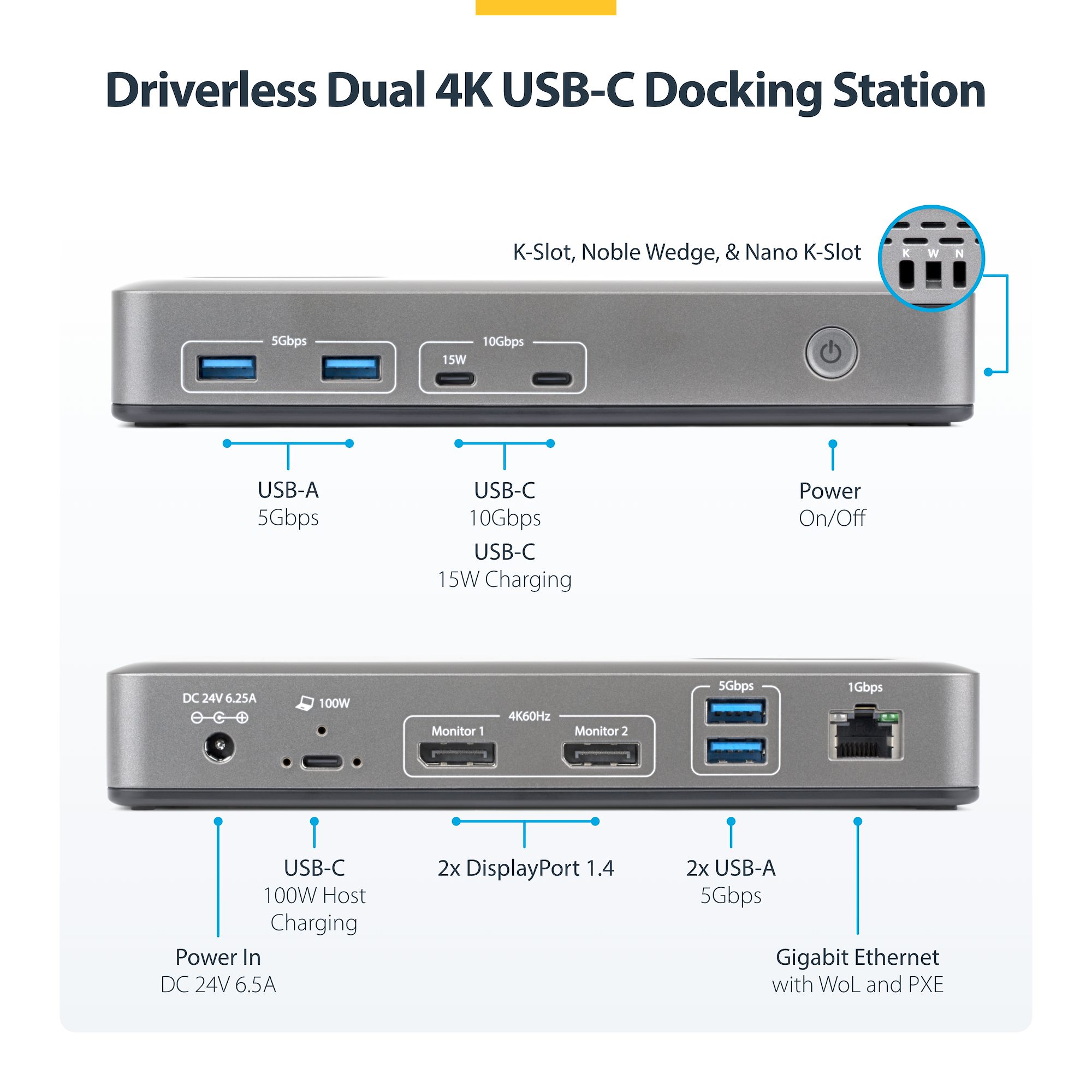 StarTech Dual-Monitor DisplayPort USB-C Docking Station - Dual 4K@60 DisplayPort Displays over USB-C - Driverless Plug-and-Play - 100W Laptop Charging - Gigabit LAN - 2x USB-C 10Gbps ports (one with 15W PD) - 4x USB-A 5Gbps (201N-USBC-DOCK)