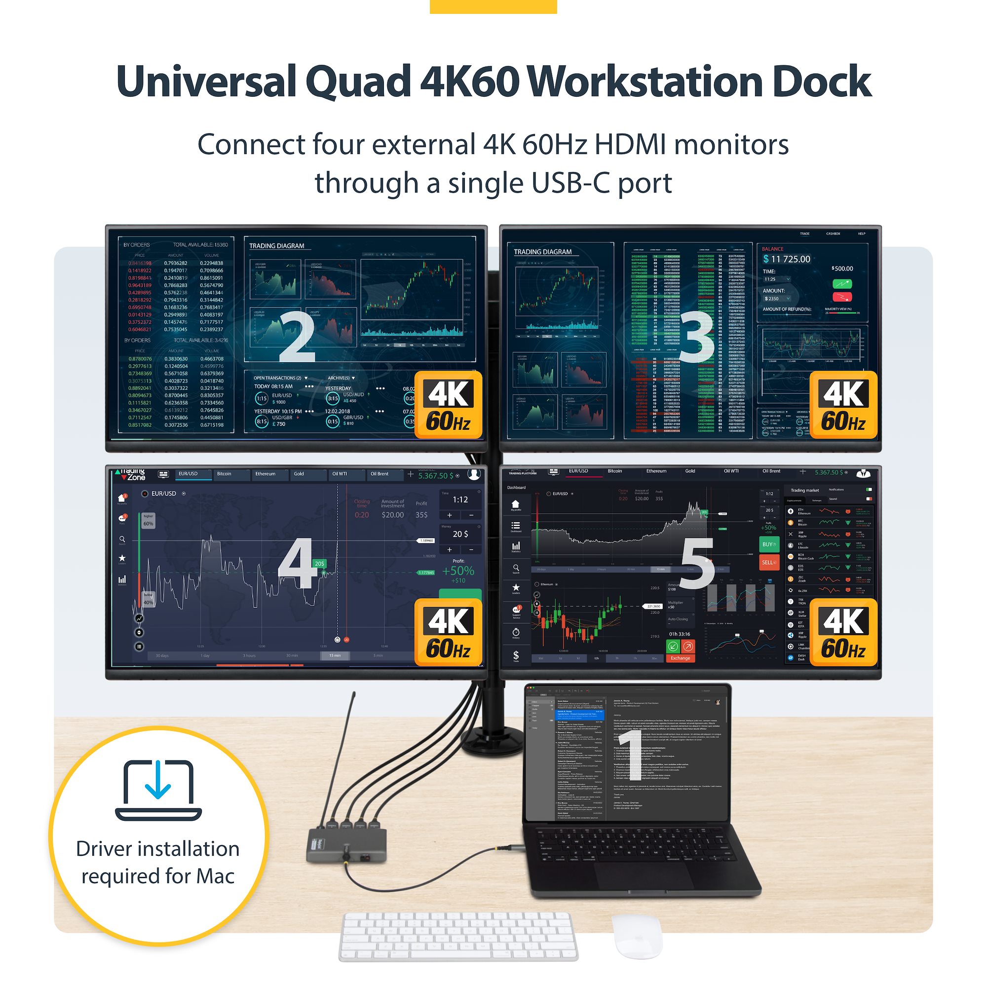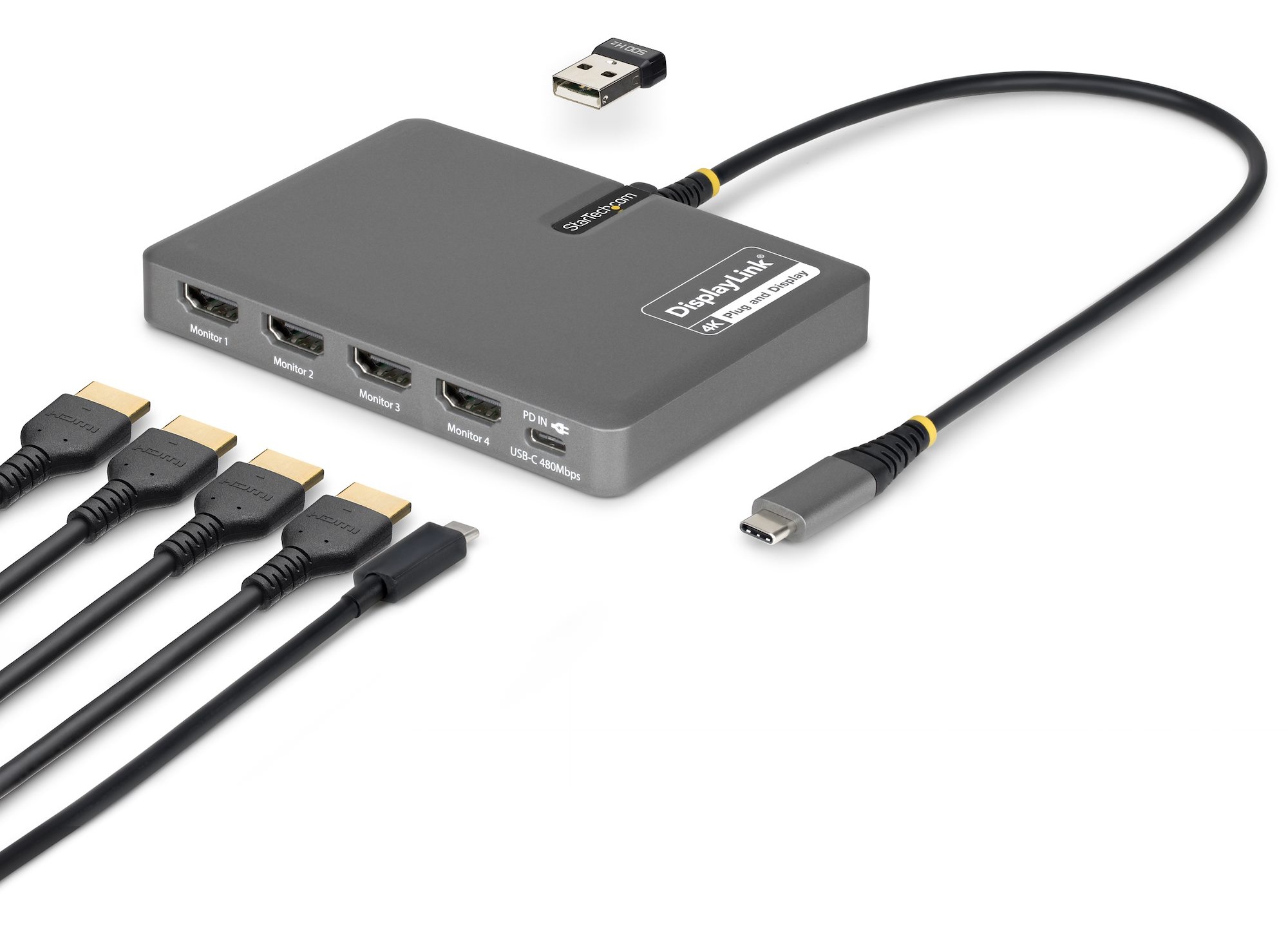 StarTech USB-C to Quad HDMI Monitor Workstation Adapter - Max. 4K@60Hz Resolution - 140W PD Passthrough for Laptop Charging - USB Port for Wireless Keyboard / Mouse - TAA Compliant (QUAD-USB-HDMI-ADAPT)