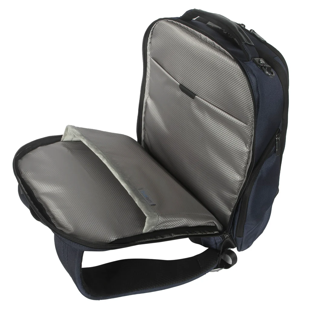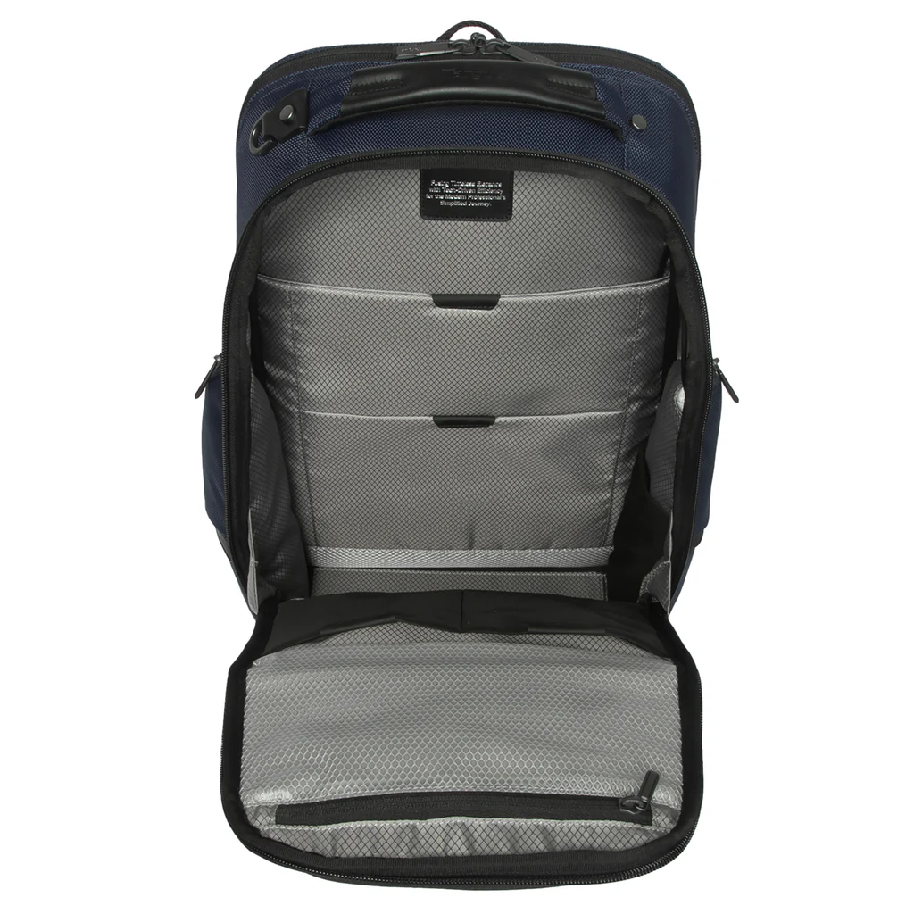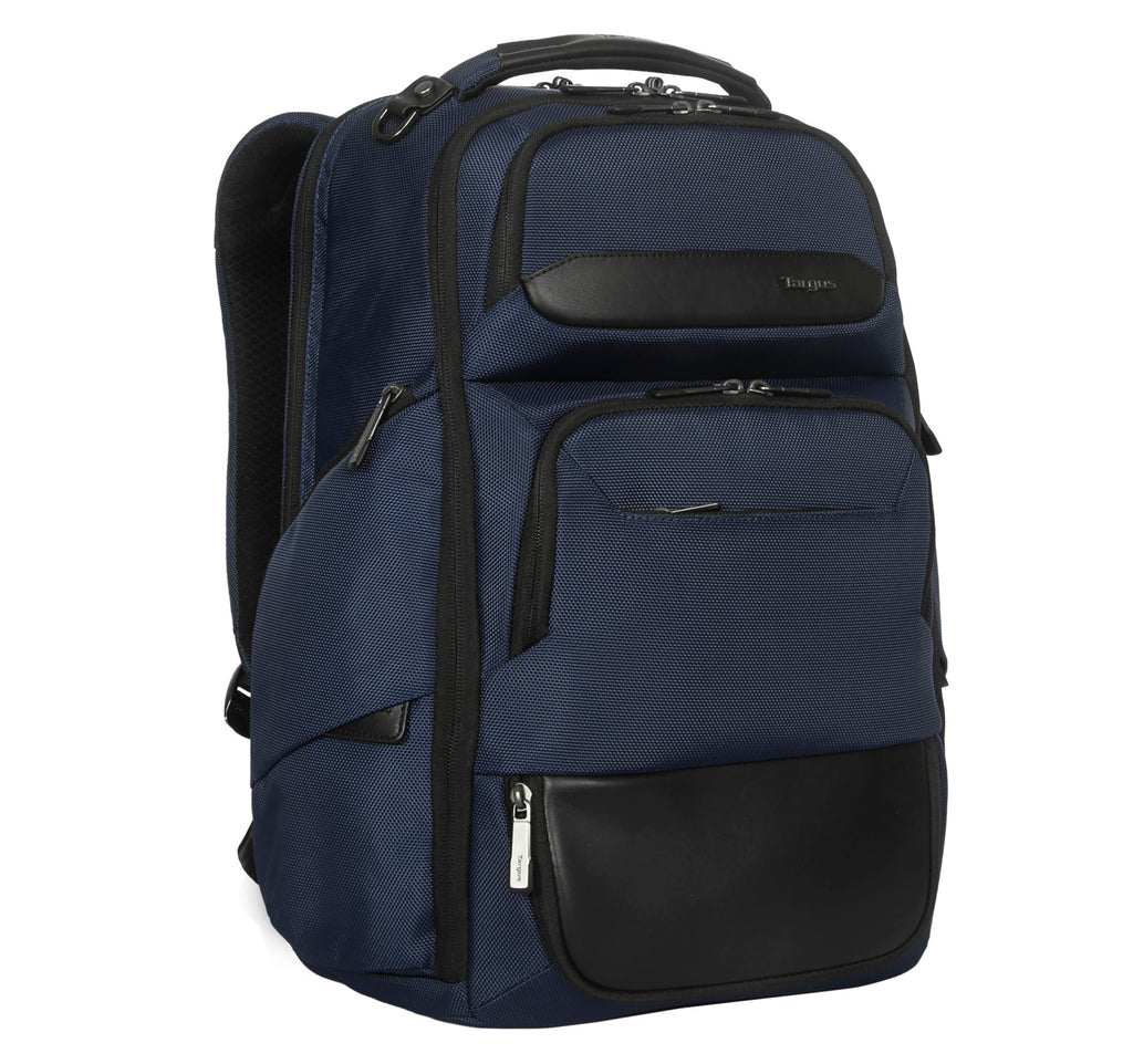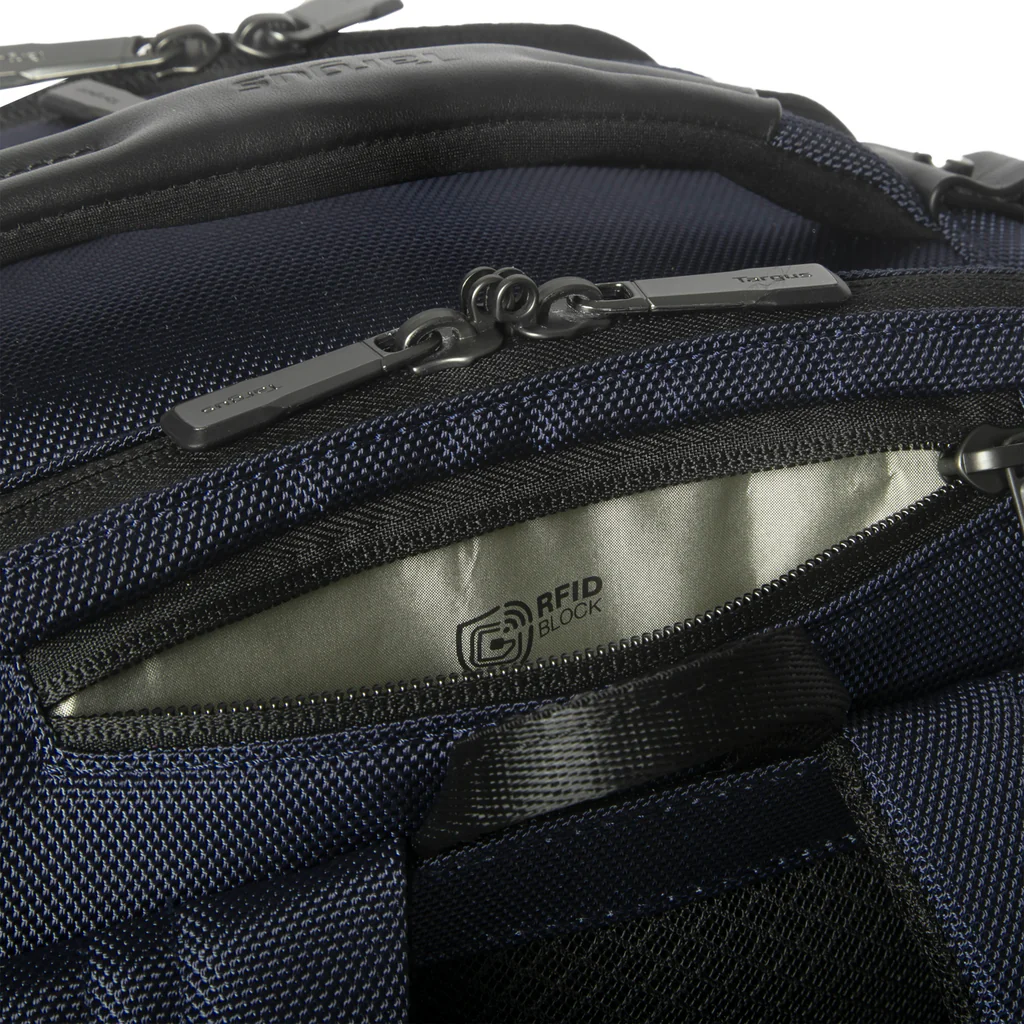Targus HeritageLuxe Backpack for 15-16” Laptops - Blue - Removeable Tech Accessory Pouch - RFID-Blocking Stash & Battery Bank Pockets - Patented Retractable USB-C Connector - Retractable Luggage Tag Holder (TBB65602GL)