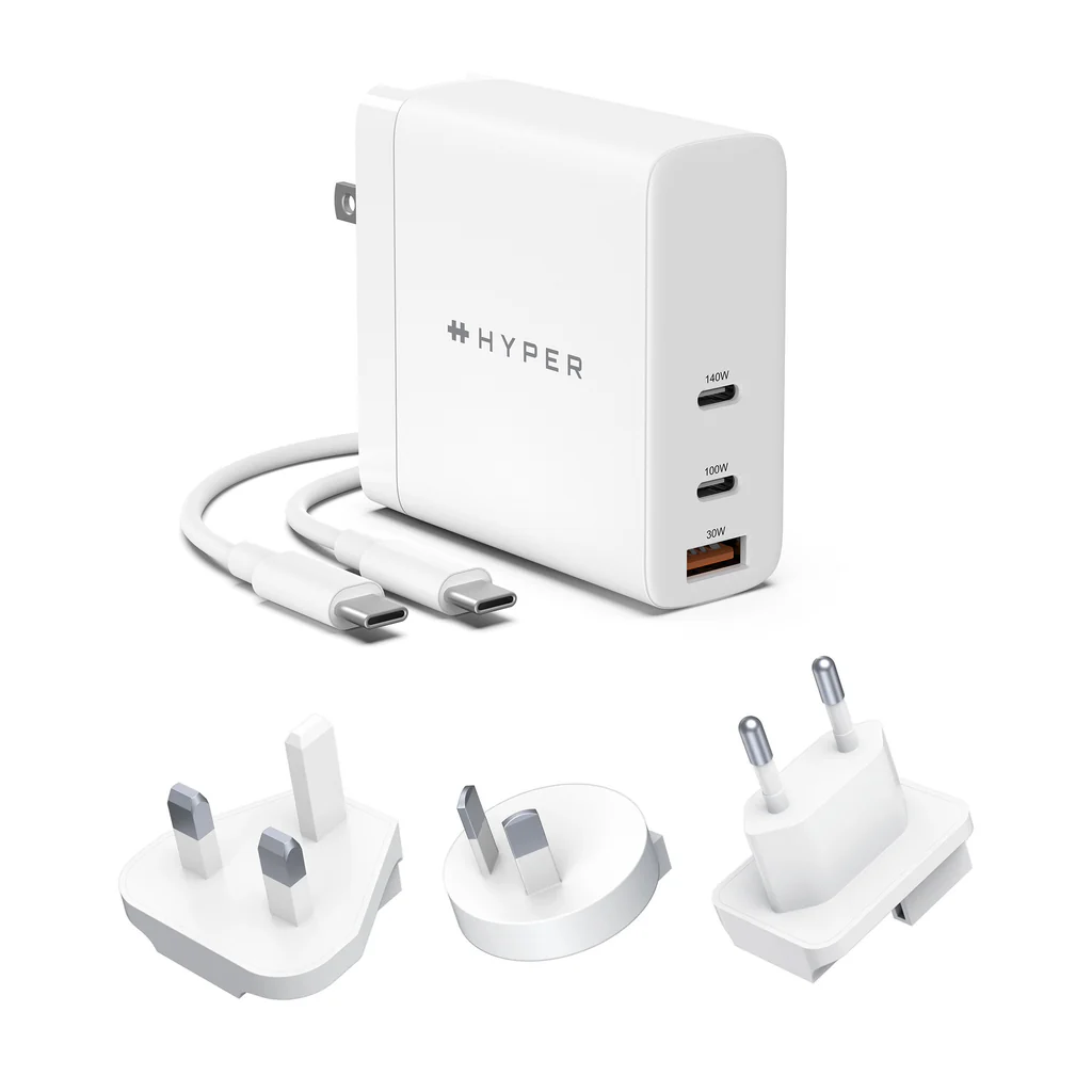 Targus HyperJuice 140W Charger with Travel Adapters - 1x USB-C PD 3.1 140W - 1x USB-C PD 100W - 1x USB-A QC 30W - Includes 2M USB-C Cable that supports 140W-240W (HJG140WW)