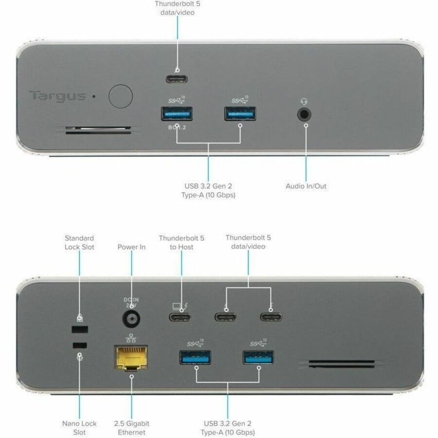 Targus Thunderbolt 5 Triple Video 8K EcoSmart Dock with 140W EPR - 3 Displays Supported - 7680x4320 - 3x Thunderbolt 5 - 4x USB 3.2 Gen2 Type-A Ports - 2.5 Gigabit Ethernet - 3.5mm Audio In/Out (DOCK230USZ)